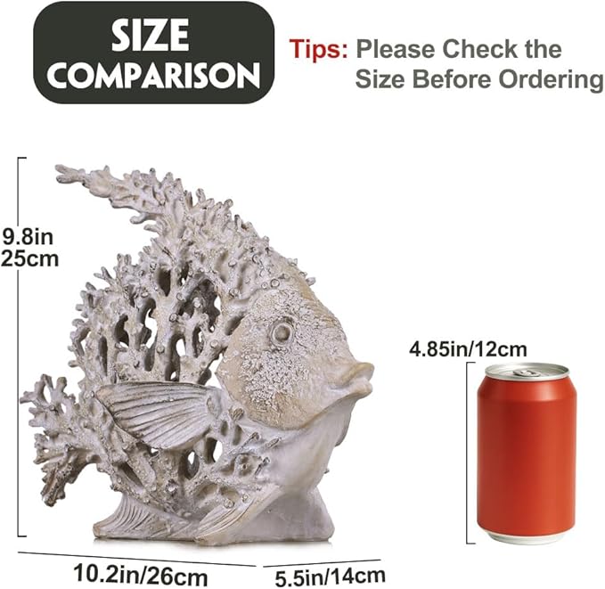 - Versatile Beach Decor for Any Surface or Setting: Sized at 10.2in x 5.5in x 9.8in, this coral reef decor fish fits effortlessly on coffee tables, shelves, and office desks. Whether placed in your bathroom, living room, or entrance, it enhances coastal shelf decor and complements all beach-themed rooms