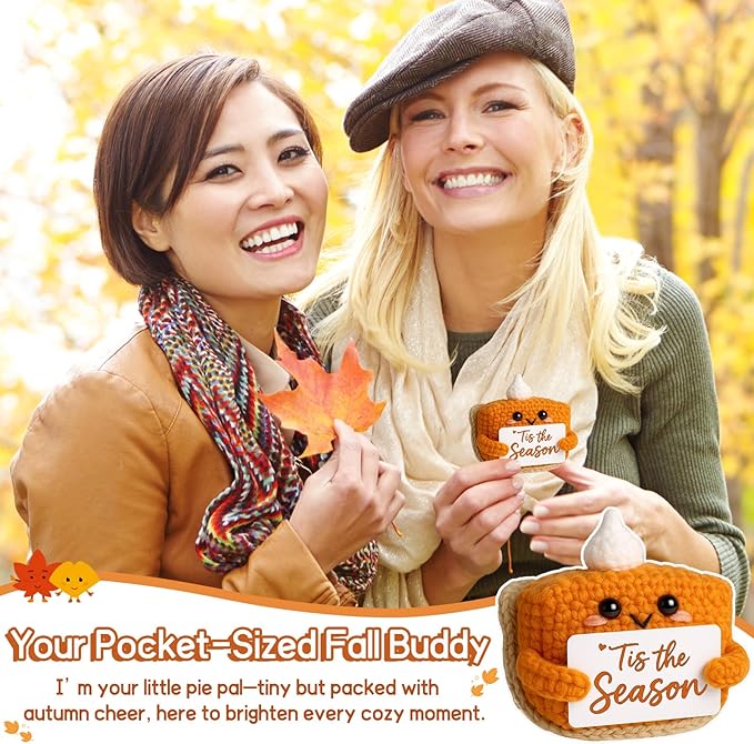 - Festive Crochet Pumpkin Pie – Delightful handmade crochet pumpkin pie with a whipped cream top and a "'Tis the Season" card, perfect for adding a cozy festive touch to your home.