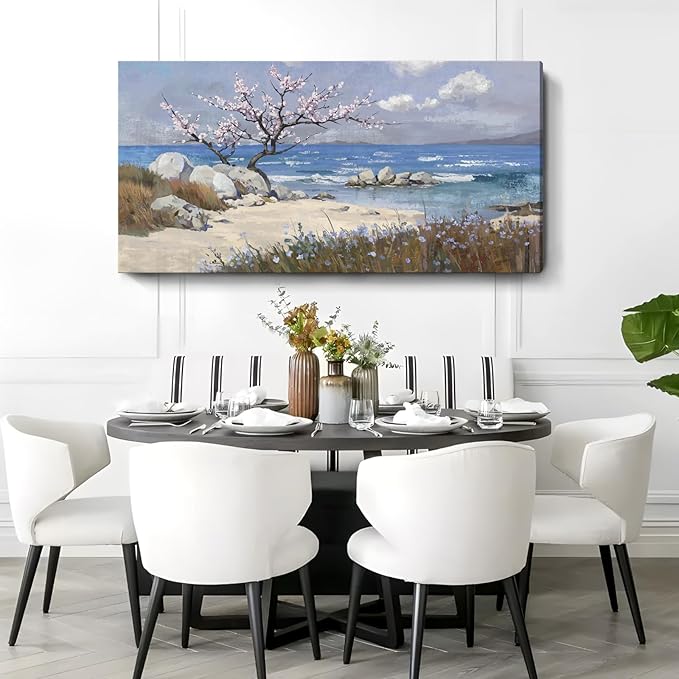 - ➤ A Calm Reminder of Hope and Strength: This oversized artwork depicts a tranquil seaside vista with a pink-blossomed tree standing strong among rocks and sand, set against a calm blue ocean and sky. Wildflowers in the foreground add a touch of life and warmth. It reminds us that even through challenges, we can bloom with hope and grace. More than just decoration, this coastal wall art inspires calm, resilience, and harmony every day.