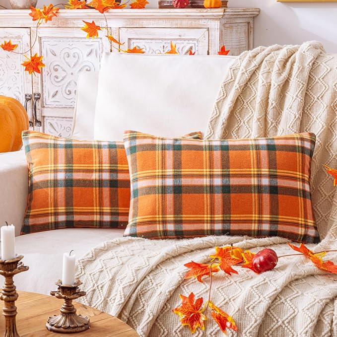 Fall Plaid Orange Green Throw Pillow Covers 12x20 Inch, Set of 2 Autumn Decorative Throw Pillows for Couch Sofa Bed Living Room Home Decor, Accent Pillow Cases for Farmhouse Couch Cushion Covers