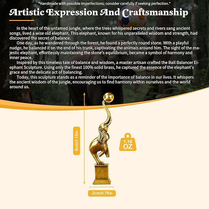 - Masterful Craftsmanship: Where brass meets balance - behold the playful poise of our Ball Balancer, a testament to timeless craftsmanship. A dance of precision and play - each curve of this brass elephant tells a story of perfect equilibrium.