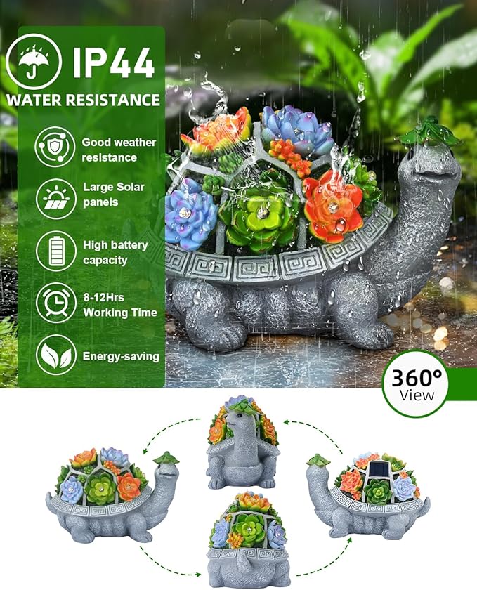 - Home Decor & Outdoor Decor: This large size solar turtle statue comes with 7 LED lights and realistic succulents. It is perfect for use as garden decor, front porch decor, patio decor, yard decor, balcony decor and backyard decor, adding brilliance to your outdoor space