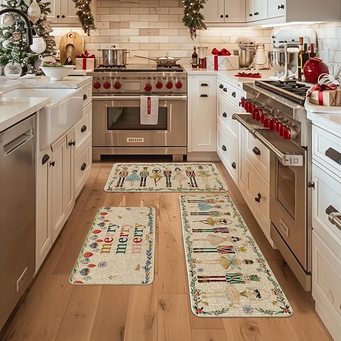 Artoid Mode Watercolor Nutcrackers Merry Christmas Decorative Kitchen Mats Set of 2, Home Party Low-Profile Kitchen Rugs - 17"x29"+17"x36"+17"x47"