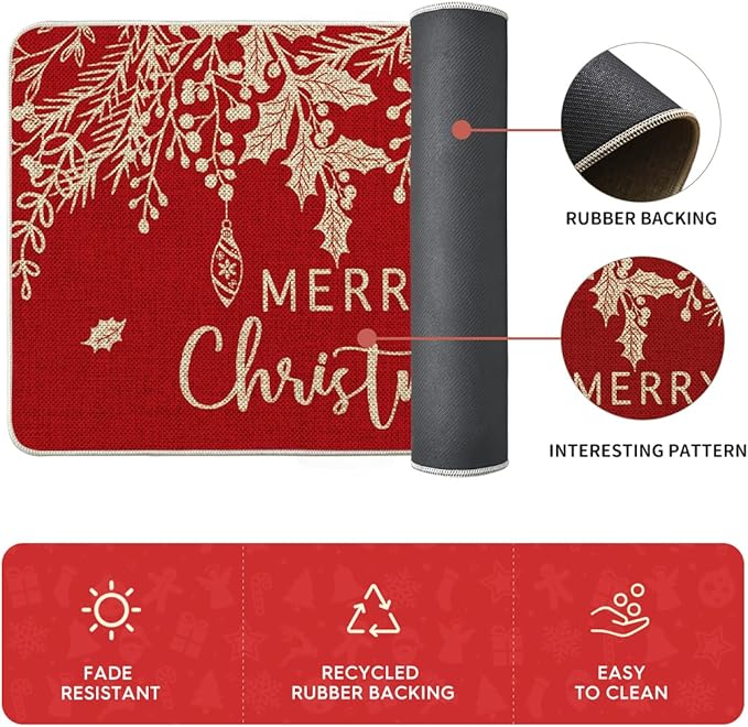 Artoid Mode Holly Pine Branches Leaves Merry Christmas Kitchen Mats Set of 2, Winter Decor Low-Profile Kitchen Rugs for Floor - 17x29 and 17x59 Inch