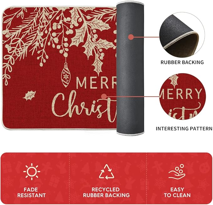 Artoid Mode Holly Pine Branches Leaves Merry Christmas Kitchen Mats Set of 2, Winter Decor Low-Profile Kitchen Rugs for Floor - 17"x29"+17"x36"+17"x47"