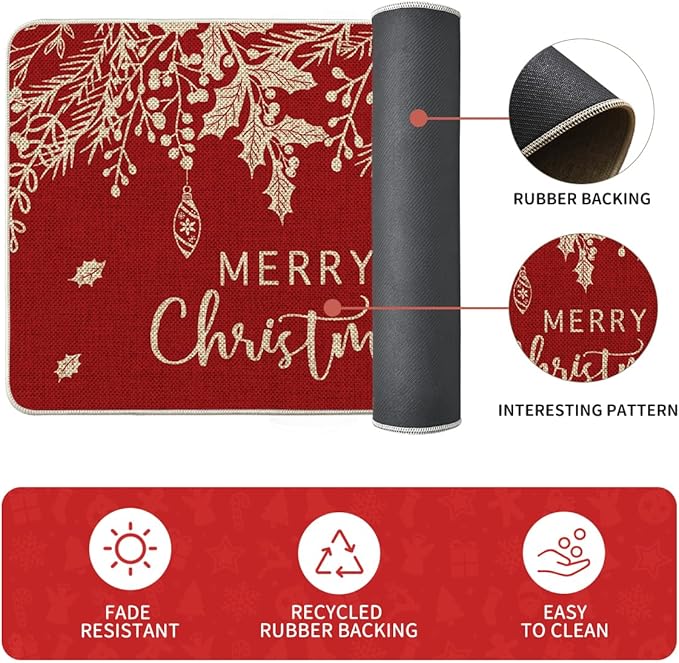 Artoid Mode Holly Pine Branches Leaves Merry Christmas Kitchen Mats Set of 2, Winter Decor Low-Profile Kitchen Rugs for Floor - 24x35 and 24x59 Inch