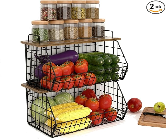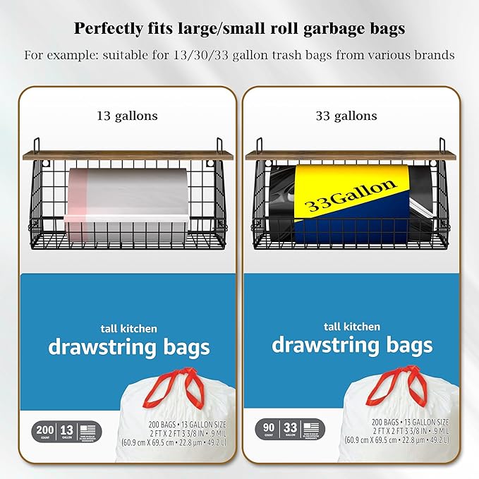 2 Pack Extra Large Kitchen Organizer Stackable Trash Bag Holder,Laundry Room Organizers Basket with Wood Top,Wall Mount Large Standard Garbage Bag Dispenser,Pantry Organizers,Under Sink Organization