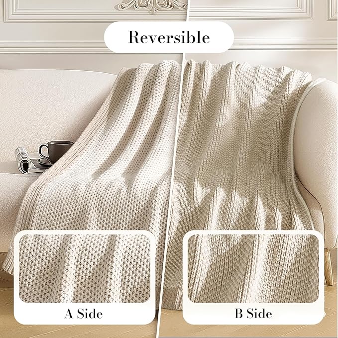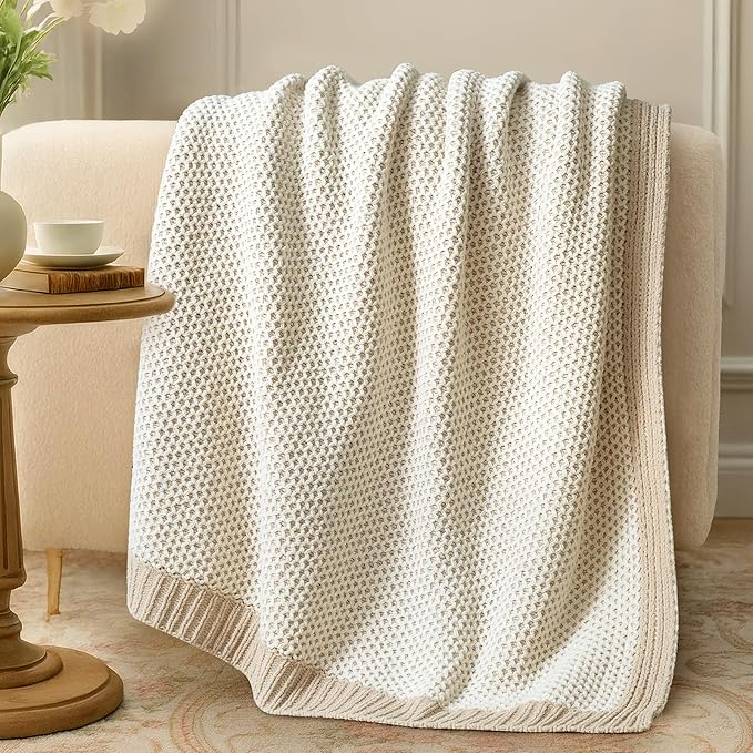 Amélie Home Honeycomb Knit Throw Blanket for Couch, Dual-Sided Soft Chenille Decorative Blankets for Sofa & Chair, 50"x60", Khaki & White