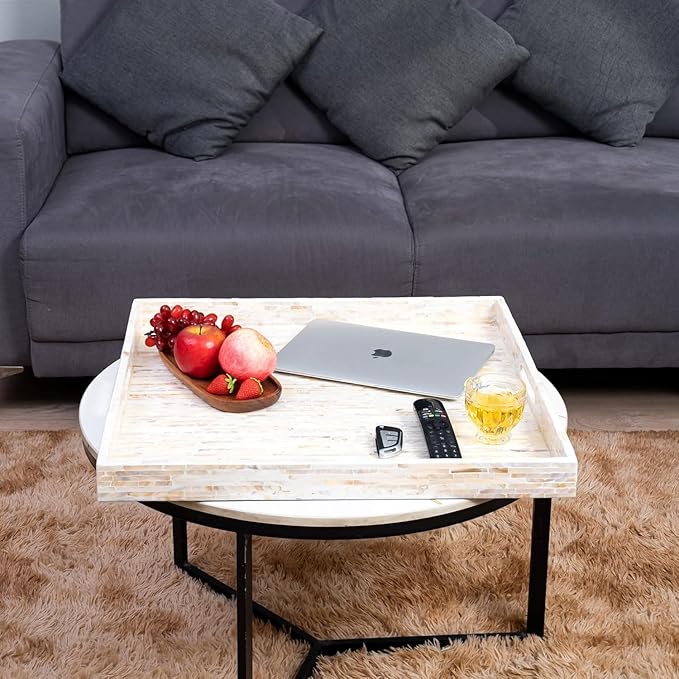 - UNIQUELY VERSATILE: Our extra-large square tray, with its mother-of-pearl pattern, is unique for decorative purposes. Use it to display candles, vases, or seasonal decorations or organize items on your couch or TV table, blending practicality with style. The tray design fits various interior styles, from contemporary to minimalist, rustic farmhouse to luxury.