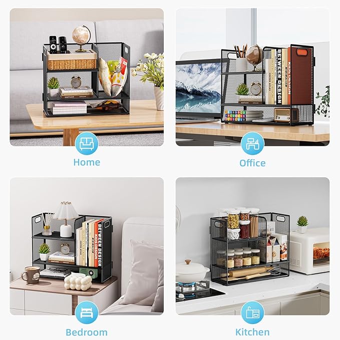 Marbrasse 3-Tier Desk Shelf Organizer with Handle, Desktop Bookshelf File Holder, Mesh Display Shelf Organizer Storage Rack for Office, Home, Supplies, Kitchen (Black)