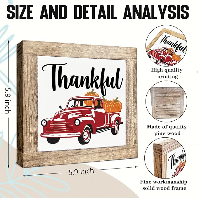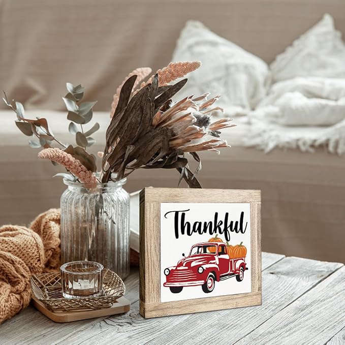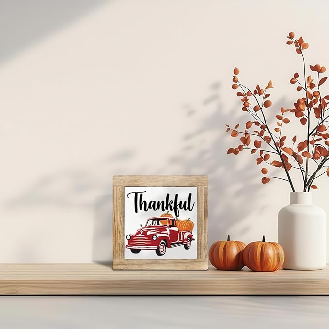 Pumpkin Harvest Decors, Thankful Signs, Pumpkin Truck Wooden Box Signs, Autumn Home Desk Table Shelf Decoration, Fall Decor, Thanksgiving Decoration, Box Sign Wood Desk Sign Decor 5.9X5.9X0.7inches