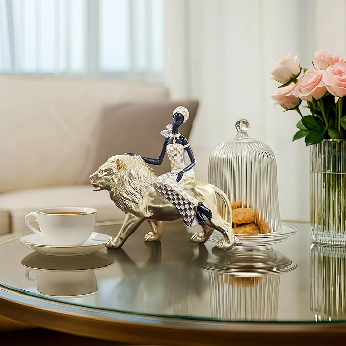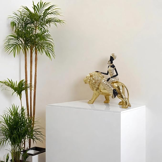 African Woman Riding Lion Statue – Gold Resin Sculpture for Home Decor, African Queen Figurine with Tribal Pattern, Cultural Art Decor for Living Room, Shelf, Office, or Gift