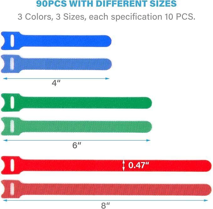 90 PCS Reusable Cable Ties 4+6+8 Inch, Adjustable Hook and Loop Straps for Cord Organization, Wire Management - Home, Office, Garage