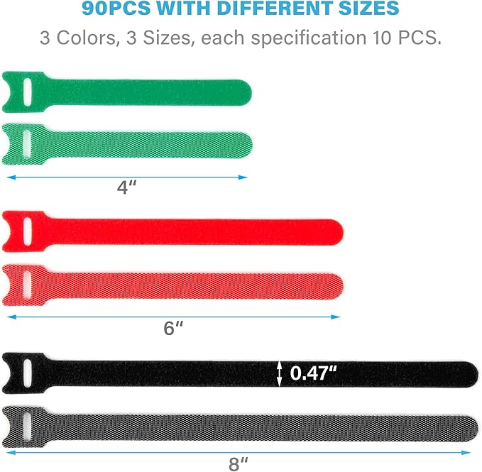 90 PCS Reusable Cable Ties 4+6+8 Inch, Adjustable Hook and Loop Straps for Cord Organization, Wire Management - Home, Office, Garage