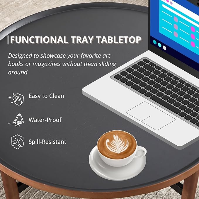 HEAH-YO Round Nesting Coffee Table Set of 2, Wood Tray Top Accent Table with Walnut Wrapped Metal Legs, Industrial & Farmhouse Side Table for Living Room/Office Reception, Black
