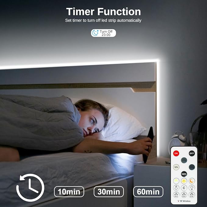 - Dimmable Lighting: Comes with RF Remote and controller(receiver), it has memory function. 3 timing functions (10min/30min/60min) can make the strip light to turn off at the set time. brightness increase/decrease (6 levels) and 4-fixed brightness levels (10%/25%/50%/100%),3 modes (jump, gradient, flicker).