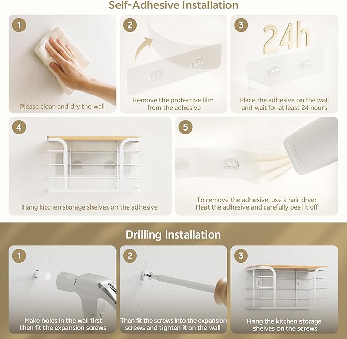 - 3 Versatile Options for Use: Use as a countertop organizer, wall mount with included adhesive strips (wait 24 hours post-install, for smooth hard walls), or drill-mount with provided accessories. Fits any home storage setup—laundry room, kitchen, or pantry