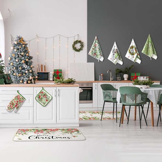 10 Pcs Christmas Kitchen Decor Set Kitchen Towels and Rugs Oven Mitts Pot Holders Absorbent Towels for Baking Cooking BBQ Gifts Home Decor(Green,Green Leaf Wreath)