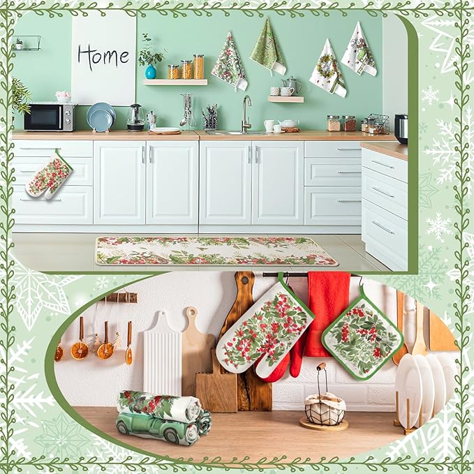 - Proper Size for Kitchen: the Christmas dish towel set measures about 15.75 x 23.62 inches/ 40 x 60 cm, the pot holders are about 7.09 x 7.09 inches/ 18 x 18 cm, the Christmas oven mitts are about 6.69 x 10.63 inches/ 17 x 27 cm and the floor mat measures about 31.5 x 19.69 inches/ 80 x 50 cm and 47.24 x 19.69 inches/ 120 x 50 cm, proper size for you to easily carry and store, meeting various daily needs
