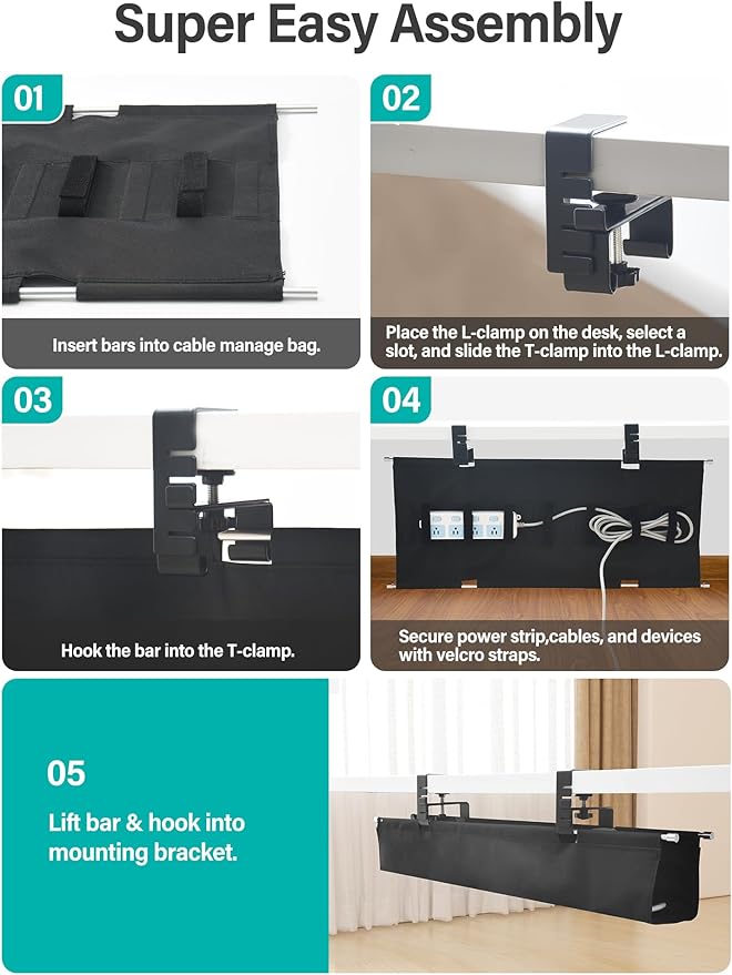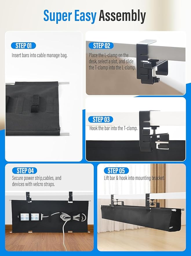 - What You Get & a Friendly Note – You’ll receive one large cable management kit (28.4"L x 4.3"W x 4.7"H) with 6 extra cable ties. 💡 Please note: A minimum 4.3-inch clearance is needed along the edge of desks with drawers or back rods for the clip to attach properly.