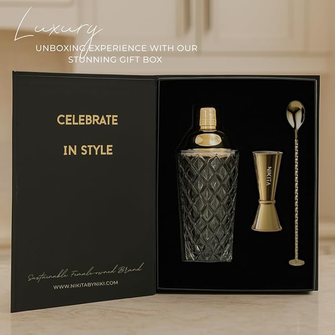 - 🍹 EVERYTHING YOU NEED - Includes a 16oz crystal-cut glass shaker with a leak-proof, stainless steel lid and built-in strainer, a matching bar spoon with muddler, and a 1.5oz measuring jigger. Every piece fits perfectly in your hand - balanced, weighted, and built to last.