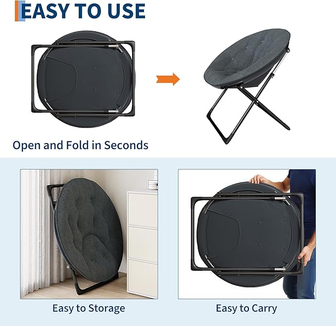 - 【No Assembly Folding Chair】Skip the hassle of complicated setup—this foldable saucer chair arrives fully assembled for immediate use. Simply unfold and relax. Its lightweight, folding design is ideal for small space living, making storage and portability effortless for bedrooms, dorms, or playrooms.