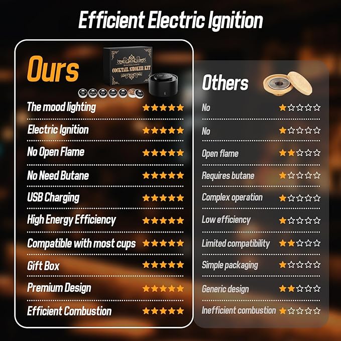 - 【Patent Design】: The Electric Whiskey Smoker Kit features a brand-new electric heating rod ignition system that directly contacts the wood chips in the tray. Using advanced technology, it quickly and evenly ignites the wood chips for a more thorough burn. No need for traditional torches, offering a safer, cleaner, reusable, eco-friendly, and energy-efficient experience.