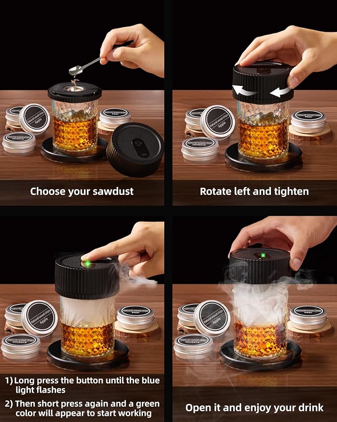 - 【Natural Wood Chips - Rich & Authentic Smoke Flavors】 Elevate your whiskey, cocktails, or coffee with our premium electric smoker. The whiskey smoker kit includes six pure wood chips—apple, cherry, pear, oak, beech, and hickory—for a smooth, natural smoky aroma. Cold-smoke your drinks or food to add depth and sophistication. Transform ordinary sips into extraordinary experiences!