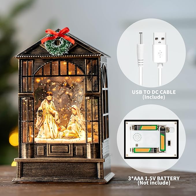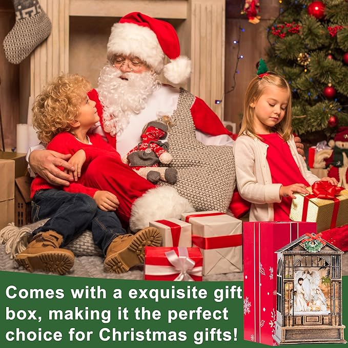 - Christmas Snow Globe: This specially designed snow globe features a house-shaped structure, with a scene of angels guarding the birth of Jesus visible through the windows. When illuminated, sparkling snowflakes and flowing water continuously dance within the sphere, accompanied by a looping Christmas carol.