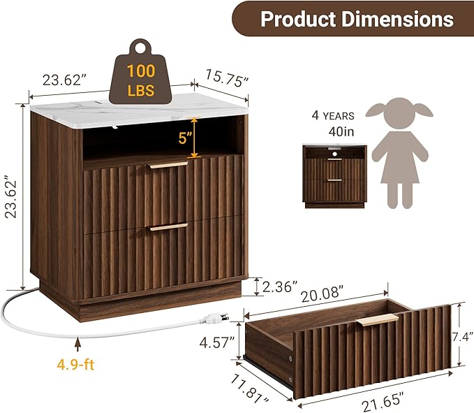 - 【Stylish & Practical Design】Favourlife nightstand features an elegant walnut finish on its surface, unique curved fluted panels as drawer decorations, a wide metal handle, and a faux stone patterned white tabletop for embellishment. Its chic design suits contemporary to mid-century styles perfectly, with sleek lines and rounded corners ensuring family safety while elevating any room's ambiance as a standout piece.