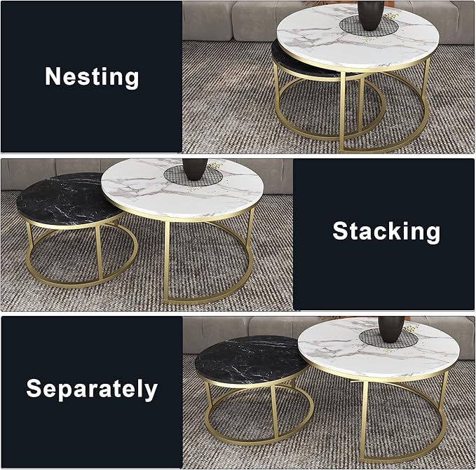 - 【Beautiful and practical】This round nesting table for the living room features a modern design style with elegant curves and simple lines. The metal base and marble grain pattern table top blend seamlessly with modern and industrial design while maintaining a rustic and minimalist aesthetic.