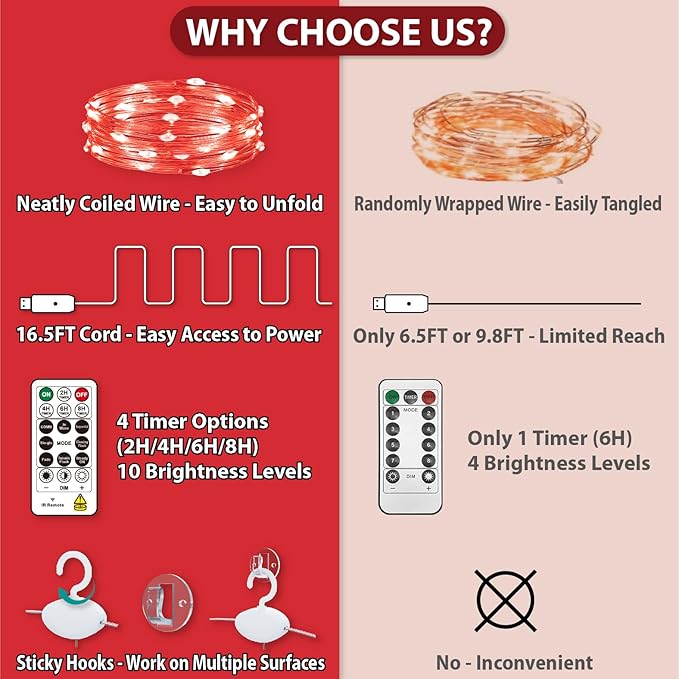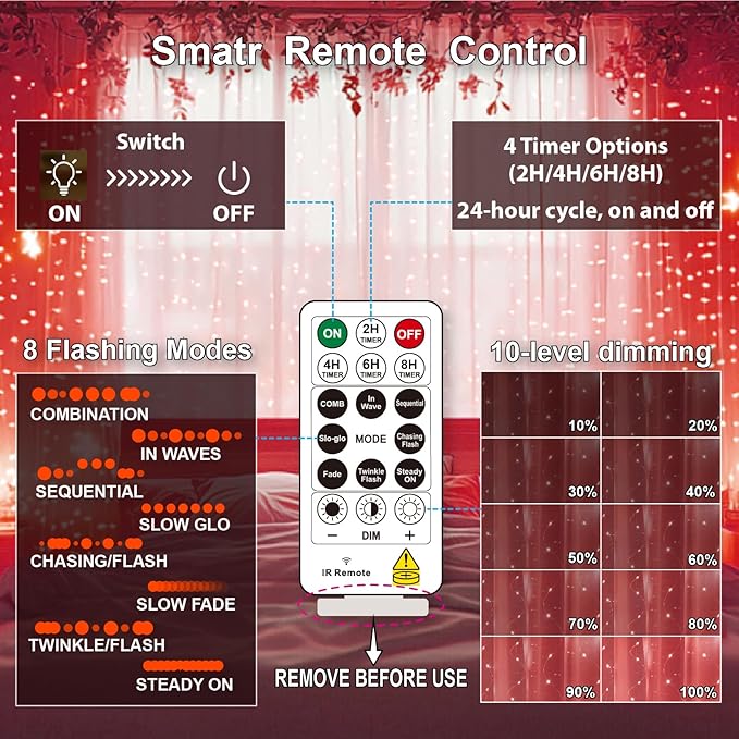 - 8 Light Settings & Timer Remote: Unlike others, our 17-Keys remote added 4 timing modes (2/4/6/8 hours on, 22/20/18/16 hours off). 8 different flash modes to choose from, and you can adjust the brightness of the lights by pressing "dim" ,“+” and "-". That are all controlled easily by a wireless remote at 10~15 meters, aim at the USB receiving direction when you press. All is in your control
