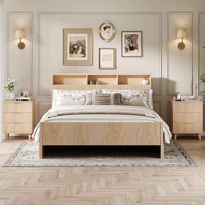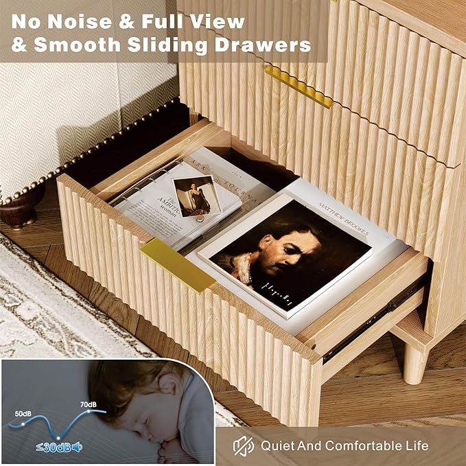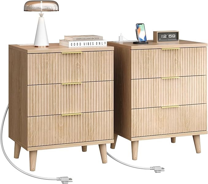 Fluted Night Stand Set of 2 with USB Charging Station, 3-Drawer Dresser Wood Modern Night Stand Bedside Table with Quiet Drawers & Large Storage End Table for Bedroom