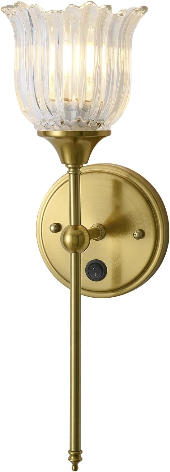 Modern Wall Sconces with Clear Flower Glass Shade 1 Pack, Mid Century Bathroom Vanity Wall Light Fixtures Gold Vintage Wall Lights with Switch for Mirror Bedroom Living Room
