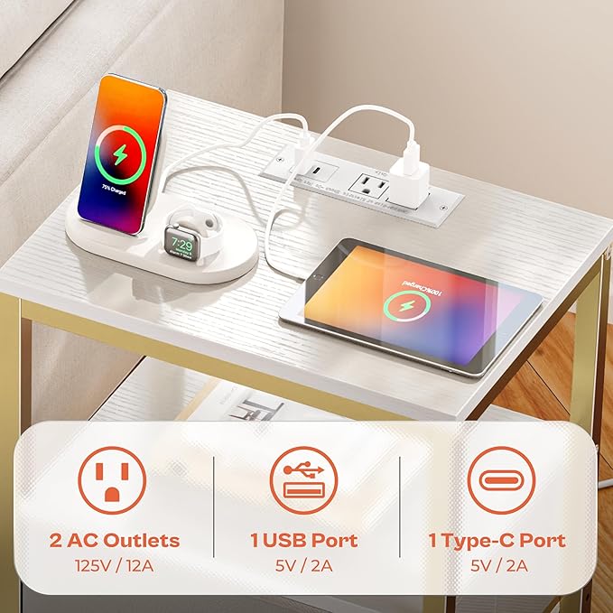 - 【Go for a Long Time】: White shelves adds white fabric drawer with PU leather finish, making it a timeless classic. Sturdy P2 particle board, robust metal frame, and durable fabric drawer, all these work excellently to give this side table with charging station strong support