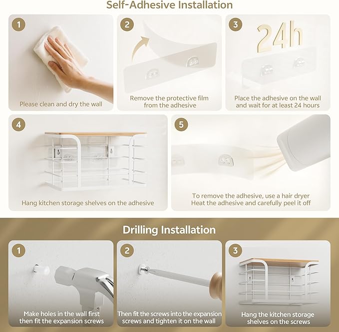 - Easy to Use: Three setups—stack on countertops, self-adhesive install, or drill-mount. For self-adhesive strips, wait 24 hours before use. Alternatively, use provided drilling accessories. Ideal for all your pantry storage needs