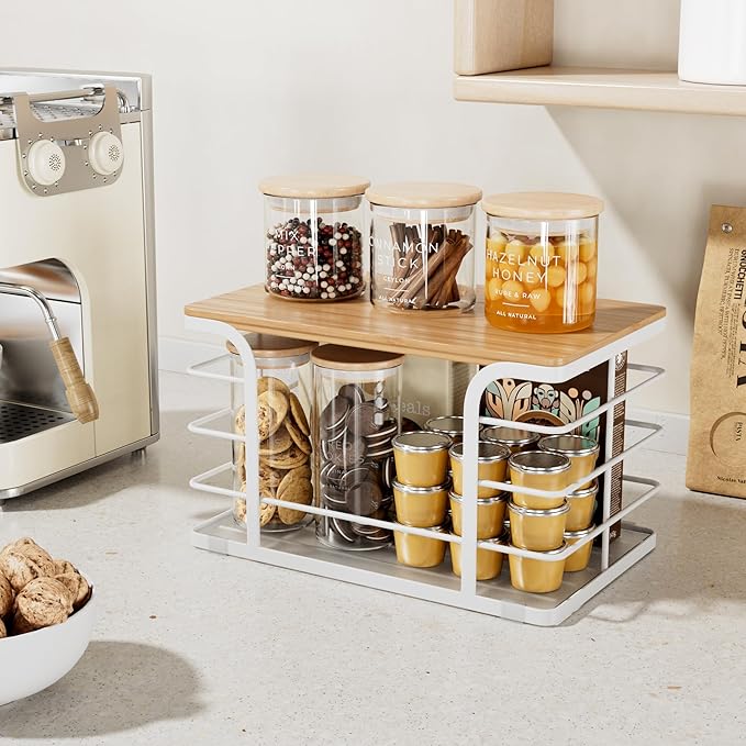 - Stackable Pantry Organizers: Crafted from natural bamboo & stainless steel, waterproof, rust-proof, sturdy & stylish. Large front openings + hollow-out design let you easily view and access stored items. Ideal for pantry organizers and storage needs