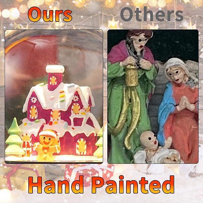 - Christmas Decoration: The Christmas-themed snow globe lantern with gingerbread house and gingerbread man! The musical snow globe cycles through 8 christmas songs, and the warm lights along with the christmas music will fill your home with Christmas Cheer.