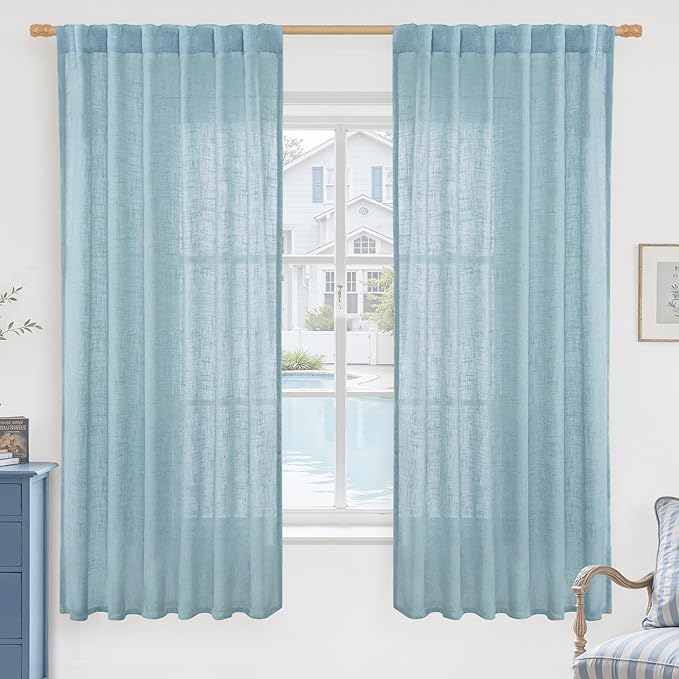 LAMIT Sheer Linen Curtains 63 Inch for Bedroom, Light Filtering Country Decor Semi Sheer Farmhouse Boho Curtains Back Tab and Rod Pocket Living Room Panels, Stone Blue, 2 Panels, 52 x 63 Inch