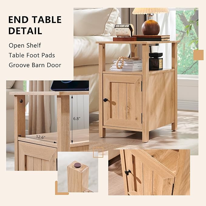 - 【Large Storage Capacity】End Table Dimensions:19.7"D x 14"W x 23.6"H. Open Shelf Dimensions:18.5"D x 12.6"W x 6.8"H. This side table set of 2 have an open shelf and an groove barn storage door. An open shelf can hold items such as books, coffee mugs, gamepads, cell phones, etc. The groove barn door features a large 13" high/15" deep storage capacity space inside for easy storage and organization.