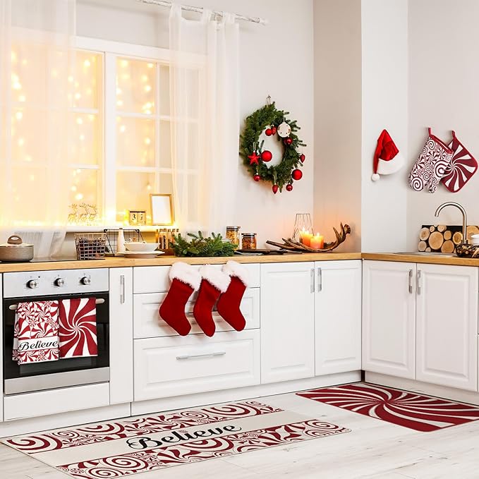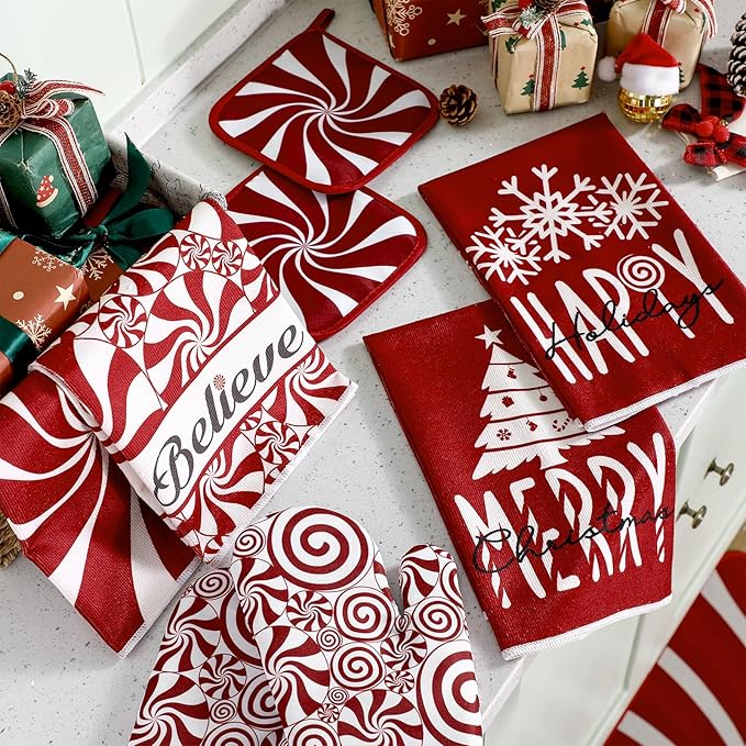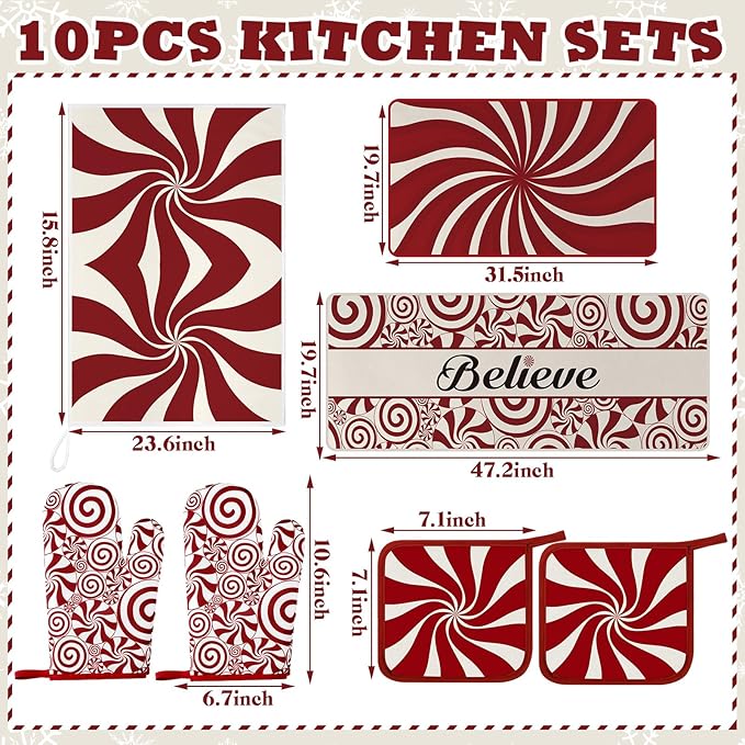 10 Pcs Christmas Kitchen Decor Set Kitchen Towels and Rugs Oven Mitts Pot Holders Absorbent Towels for Baking Cooking BBQ Gifts Home Decor(Red,Christmas Peppermint Candy)