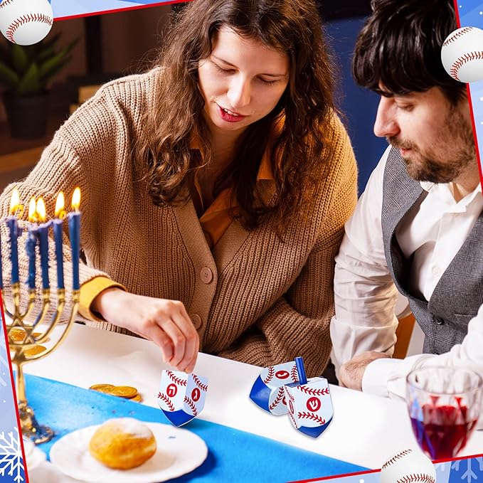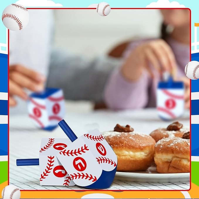 - Design: these Hanukkah spinning tops are designed with white background, Hebrew letters, English Translation and baseball elements, which is very beautiful and adds a lot of fun to the Hanukkah