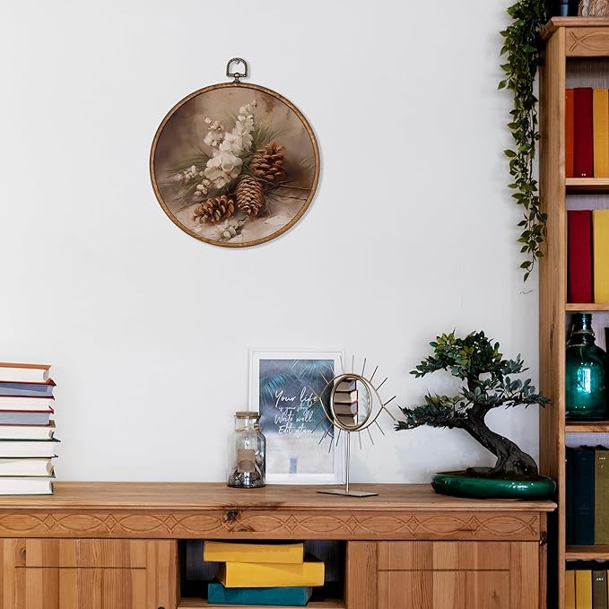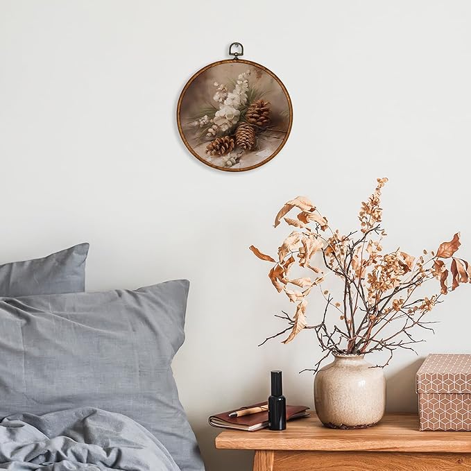 KSDUT Vintage Christmas Wall Decor Art - Retro Pine Cone Christmas Wall Art Canvas Frame Hanging Prints, Merry Xmas Holiday Round Wall Art Decor for Home Farmhouse Decorations 10"x10"