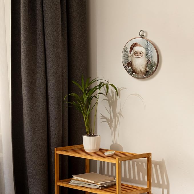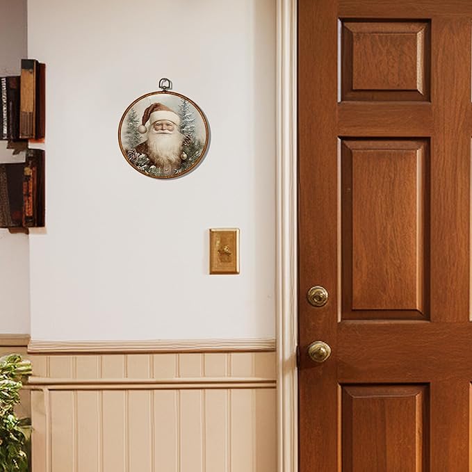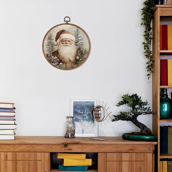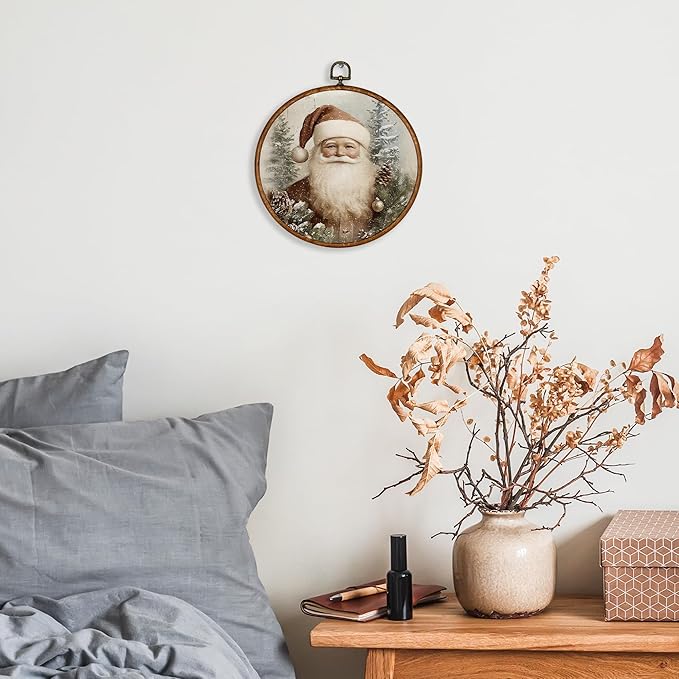 KSDUT Vintage Santa Claus Wall Decor Art - Retro Christmas Wall Art Canvas Frame Hanging Prints, Merry Christmas Xmas Holiday Round Wall Art Decor for Home Farmhouse Decorations 10"x10"