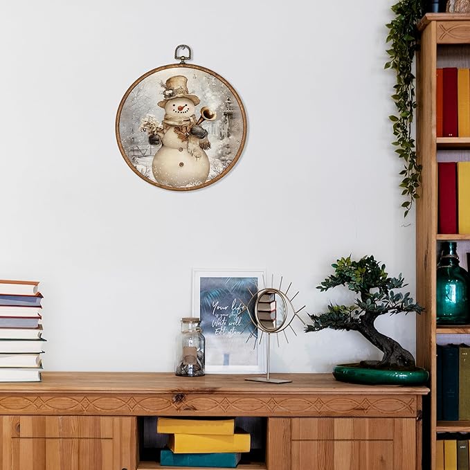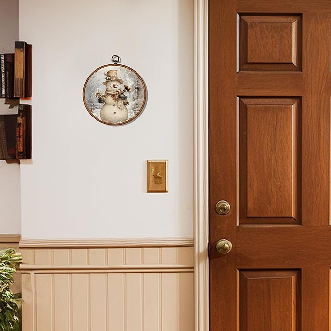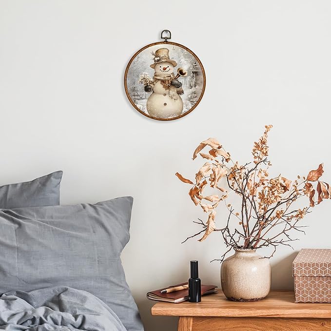 KSDUT Vintage Snowman Wall Decor Art - Retro Christmas Winter Wall Art Canvas Frame Hanging Prints, Merry Xmas Holiday Round Wall Art Decor for Farmhouse Home Decorations 10"x10"