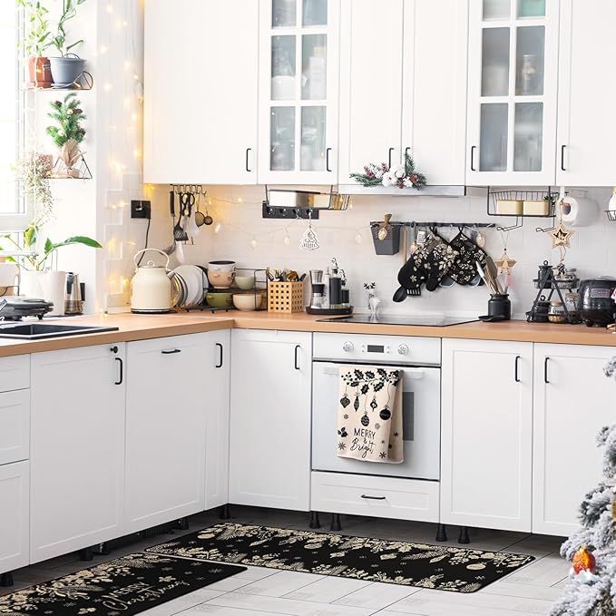 10 Pcs Christmas Kitchen Decor Set Kitchen Towels and Rugs Oven Mitts Pot Holders Absorbent Towels for Baking Cooking BBQ Gifts Home Decor(Black and Gray,Pine and Holly)