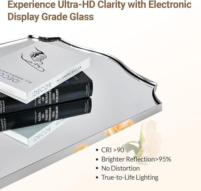 - 【Rust-Proof Stainless Steel Frame】: (N.W:24LBS). Crafted from stainless steel with oxidation-resistant properties, this chrome bathroom mirror offers enhanced stability and a longer lifespan. Shatterproof 4mm HD glass is supported by a 9mm MDF backboard (most others just 3mm ), surrounded by a 1/17" gap with unique curved corner design to give a seamless finish