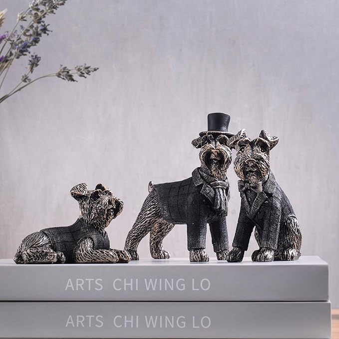 - Dogs Statue Design:This charming set of three gentleman Schnauzer dog figurines captures a story in resin.It includes a thoughtfully sitting scholar,a proudly standing gentleman,and an adorably lounging companion,depicting delightful daily dog moments.Perfect for adding dynamic elegance and narrative charm to your desk, shelf, or home decor.