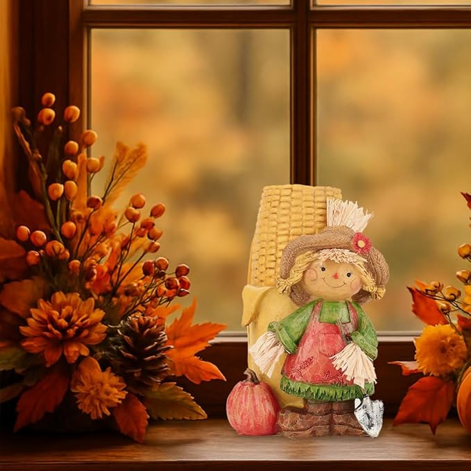 Handcrafted Thanksgiving Scarecrow Figurines, Fall Harvest Tabletop Decorations with Candle Holder, Autumn Resin Decor for Home, Porch, or Garden (Girl)