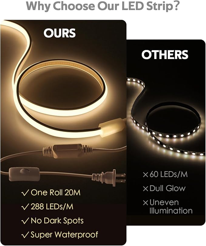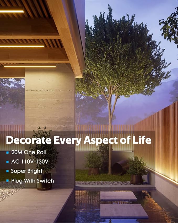 - 【Premium Quality, Bright and Long】 AC 110-130V Input, 65.6ft/20M continuous length, super brightnes, high-density 288 LEDs/M, total 5760leds/20M, 8W/M, 3000K, CRI>85. It solves the problems of low brightness and short length of 12V/24V low-voltage light strip. Plug and play, no power adapter required. Suitable for lighting projects that need long and premium LED strip.